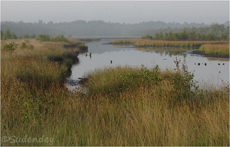 Eine weitere Blänke etwa eine Stunde nach Sonnenaufgang. Hartnäckig kämpfte der Nebel über dem Wasser gegen die Sonne an: