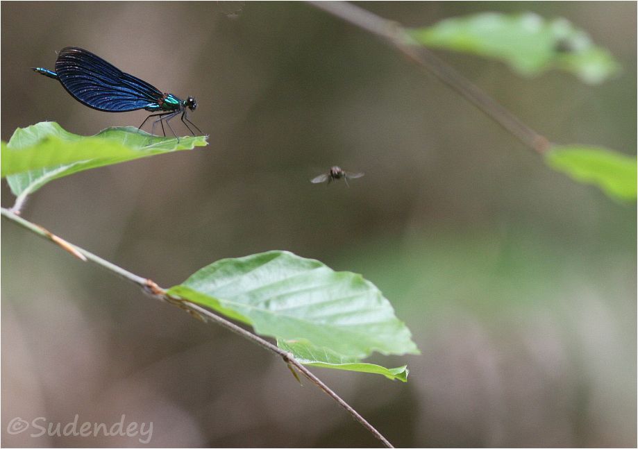 Doch damit nicht genug, denn plötzlich tauchte aus dem dunkelsten Schatten des Bachbetts auch noch die gezeigte Blauflügelige Prachtlibelle auf, steuerte eine Lichtung an und stellte sich auf das Blatt einer Rotbuche.